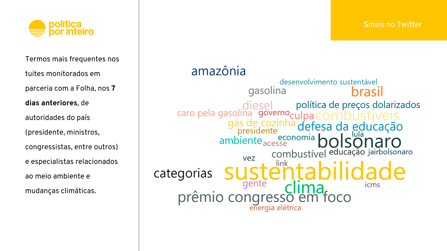 Nuvem de frases mais frequentes nos tuítes da semana, monitorados em parceria com a Folha, de autoridades do país (presidente, ministros, congressistas, entre outros) e especialistas relacionados ao meio ambiente e mudanças climáticas.