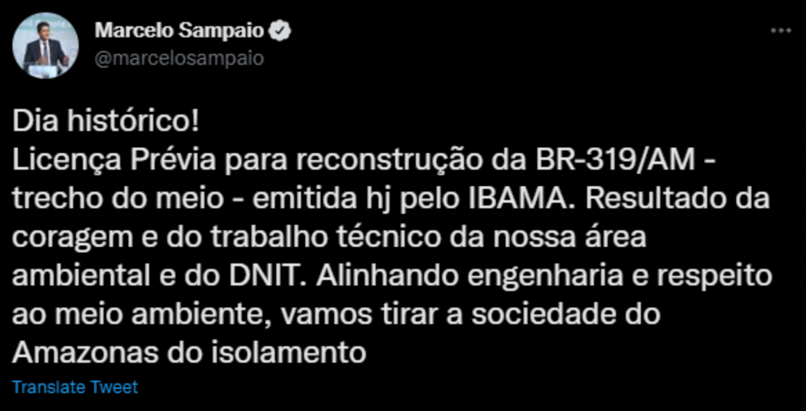Em tweet o ministro de Infraestrutura, Marcelo Sampaio, declarou ser um “dia histórico”, afirmando que vai “tirar a sociedade do Amazonas do isolamento”. No entanto, o Observatório BR 319, iniciativa que reúne diversas organizações em torno das questões socioambientais relacionadas às obras da rodovia, enxerga com grande preocupação a emissão da Licença Prévia para o Trecho do Meio, principalmente neste momento de disputa eleitoral. Em nota, Fernanda Meirelles, diretora executiva do Observatório, afirma que essa decisão claramente possui motivação política e etapas importantes desse processo foram ignoradas. Além disso, Fernanda destaca que as ações de fiscalização são insuficientes para coibir grilagem, invasões, desmatamento e especulação fundiária, pressões que vêm aumentando exponencialmente nos últimos anos.